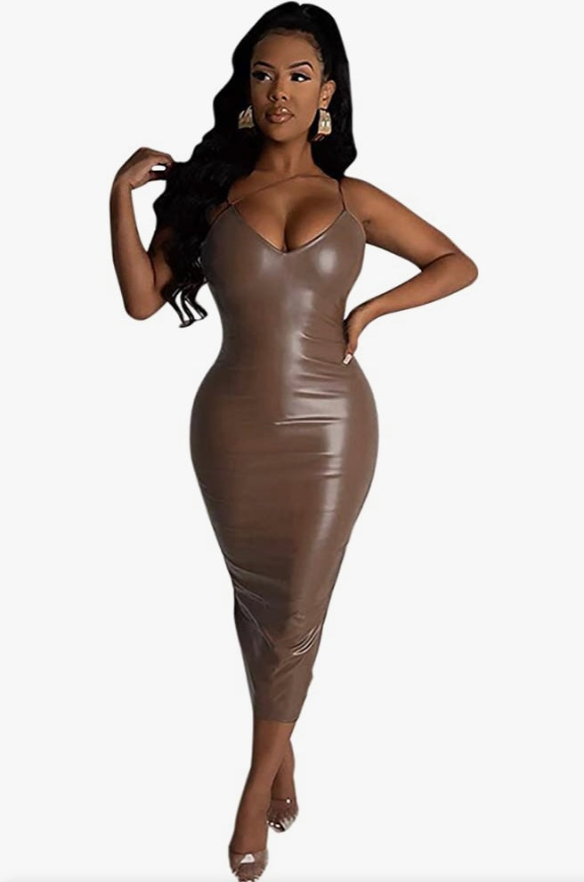 PU Leather Bodycon Dress Asymmetrical Spaghetti Strap Dress Sleeveless Split Club Party Dress